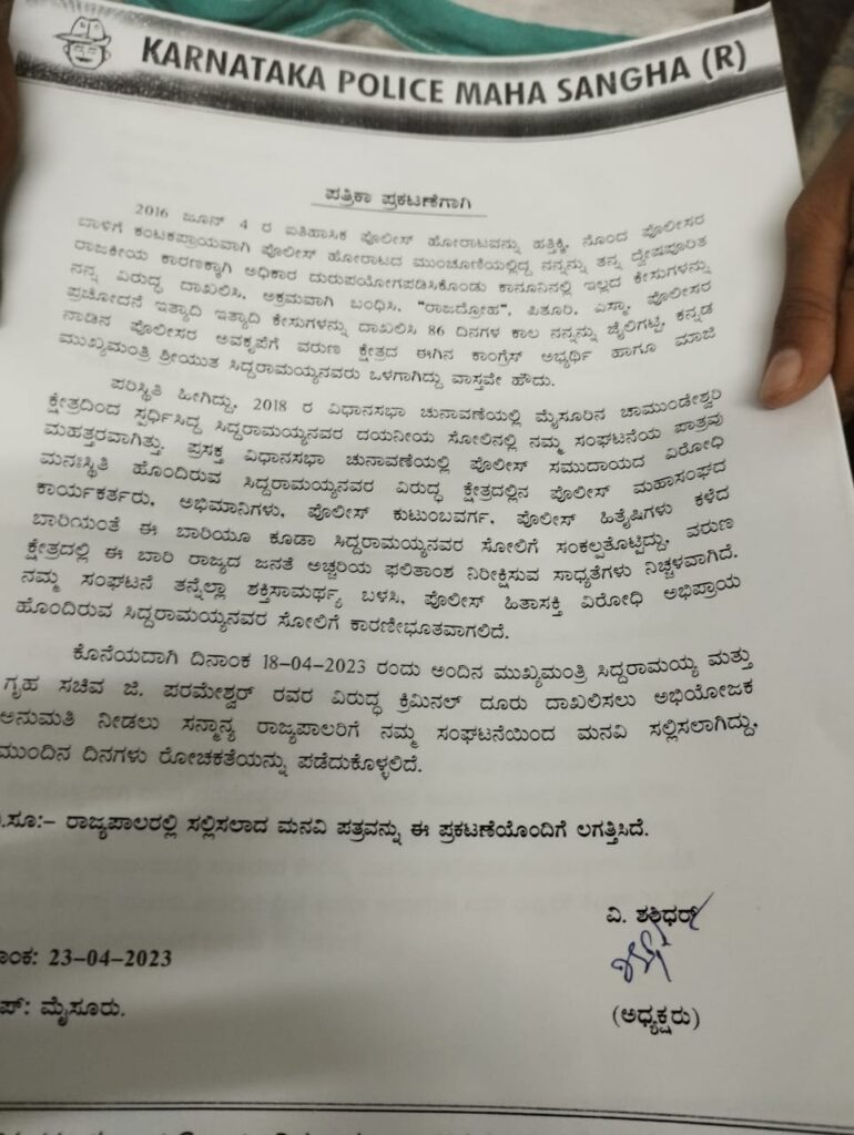 ಸಿದ್ದರಾಮಯ್ಯ ಸೋಲಿಗೆ ಪೊಲೀಸರು ಸಂಕಲ್ಪ ತೊಟ್ಟಿದ್ದಾರಂತೆ…ಕರ್ನಾಟಕ ಪೊಲೀಸ್ ಮಹಾಸಂಘ ಹೊರಡಿಸಿದೆ ಅಚ್ಚರಿ ಪ್ರಕಟಣೆ…