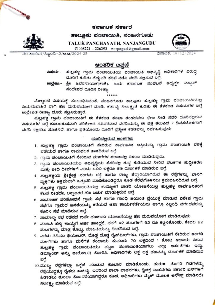 ಹುಲ್ಲಹಳ್ಳಿ ಗ್ರಾಮ ಪಂಚಾಯ್ತಿ ಅಭಿವೃದ್ದಿ ಅಧಿಕಾರಿ ವಿರುದ್ದ ಹಣಕಾಸು ದುರುಪಯೋಗ,ನಿರ್ವಹಣೆಯಲ್ಲಿ ಲೋಪದೋಷಗಳ ಬಗ್ಗೆ ದೂರುಗಳು ಬಂದ ಹಿನ್ನಲೆ ತೆನಿಖೆ ನಡೆಸುವಂತೆ ನಂಜನಗೂಡು ತಾಲೂಕು ಪಂಚಾಯ್ತಿ ಕಾರ್ಯನಿರ್ವಾಹಕ ಅಧಿಕಾರಿ ಜೆರಾಲ್ಡ್ ರಾಜೇಶ್ ಆದೇಶ ಹೊರಡಿಸಿದ್ದಾರೆ.