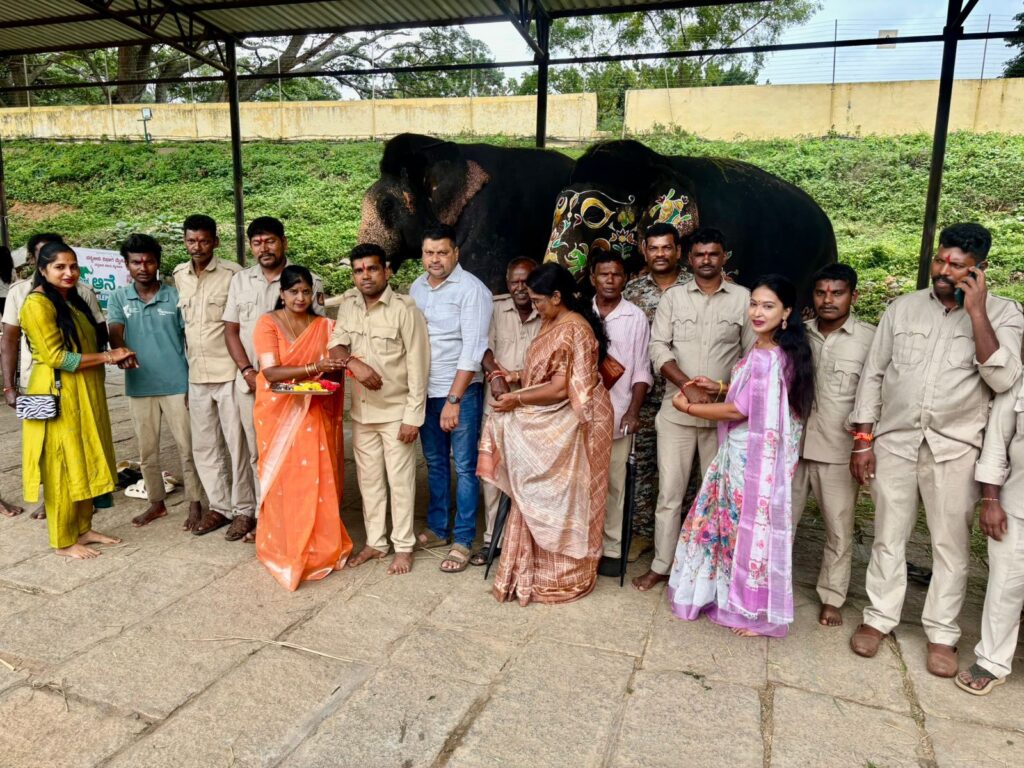 ದಸರಾ ಮಹೋತ್ಸವ ಆಚರಣೆಗಾಗಿ ಕಾಡಿನಿಂದ ನಾಡಿಗೆ ಬಂದ ಗಜಪಡೆಯ ಮಾಹುತರು ಹಾಗೂ ಕಾವಾಡಿಗರು ಮತ್ತು ಅರಣ್ಯ ಇಲಾಖೆ ಅಧಿಕಾರಿಗಳಿಗೆ ರಾಖಿ ಕಟ್ಟುವ ಮೂಲಕ ರಕ್ಷಾ ಬಂಧನ ಆಚರಣೆ ಮಾಡಲಾಯಿತು.ಇದೇ ವೇಳೆ ಶ್ರಾವಣ ಮಾಸದ ಲಡ್ಡು ಪ್ರಸಾದ ವಿತರಣೆ ಮಾಡಿ ದಸರಾ ಮಹೋತ್ಸವ ಯಶಸ್ಸಿಗಾಗಿ ಮಹಿಳೆಯರು ಹಾರೈಸಿದರು.