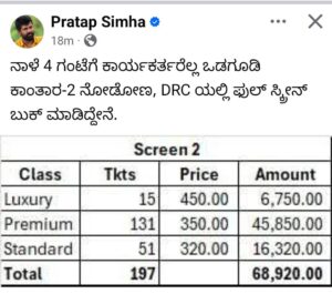 ಬಿಜೆಪಿ ಕಾರ್ಯಕರ್ತರಿಗೆ ಕಾಂತಾರಾ ಮೂವಿ ವೀಕ್ಷಿಸಲು ಆಫರ್…ಮಾಜಿ ಸಂಸದ ಪ್ರತಾಪ್ ಸಿಂಹ ಆಹ್ವಾನ…ಡಿಆರ್ ಸಿಯಲ್ಲಿ ಬುಕ್ ಮಾಡಿ ಇನ್ವೈಟ್…