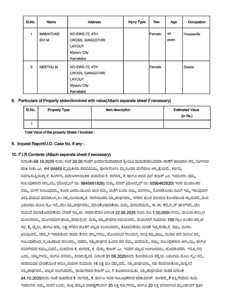 ಈ ಬೆಳವಣಿಗೆಯಿಂದ ಮೈಸೂರಿನ ಗಂಗೋತ್ರಿ ಬಡಾವಣೆಯ ವಧು ಕುಟುಂಬ ಆತಂಕಕ್ಕೆ ಸಿಲುಕಿದೆ.ವರನಾಗಬೇಕಿದ್ದ ತೇಜಸ್,ಈತನ ತಾಯಿ ನಾಗರತ್ನ,ತಂದೆ ಮಹದೇವ,ಶಶಿಕುಮಾರ್ ಹಾಗೂ ಸುಮ ಎಂಬುವರ ವಿರುದ್ದ ಸರಸ್ವತಿಪುರಂ ಪೊಲೀಸ್ ಠಾಣೆಯಲ್ಲಿ ಪ್ರಕರಣ ದಾಖಲಾಗಿದೆ.ಗಂಗೋತ್ರಿ ಬಡಾವಣೆಯ ಮಮತಾದೇವಿ ಎಂಬುವರ ಮಗಳು ಡಾ.ನೀತು ಜೊತೆ ಕೂರ್ಗಳ್ಳಿ ಗ್ರಾಮದ ತೇಜಸ್ ಜೊತೆ ಆಗಸ್ಟ್ 31 ರಂದು ನಿಶ್ಚಿತಾರ್ಥ ನೆರವೇರಿತ್ತು.ನಿಶ್ಚಿತಾರ್ಥ ವೇಳೆ ವರನಿಗೆ 150 ಗ್ರಾಂ ಚಿನ್ನ,ಒಂದು ವಜ್ರದ ಉಂಗುರ,10 ಲಕ್ಷ ಕ್ಯಾಶ್ ವರದಕ್ಷಿಣೆಯಾಗಿ ನೀಡಲಾಗಿತ್ತು.ಹುಡುಗನ ಮನೆಯವರ ಬೇಡಿಕೆಯಂತೆ ಕೋಟೆ ಹುಂಡಿ ಗ್ರಾಮದಲ್ಲಿರುವ ವಿಹಂಗಮ ಹೋಂಸ್ಟೇ ನಲ್ಲಿ ನಿಶ್ಚಿತಾರ್ಥ ಮಾಡಿಕೊಡಲಾಗಿತ್ತು.ಜೊತೆಗೆ ಸಾ.ರಾ ಕನ್ವೆನ್ಷನ್ ಹಾಲ್ ನಲ್ಲೇ ಮದುವೆ ಮಾಡಬೇಕೆಂಬ ಷರತ್ತು ಹಾಕಲಾಗಿತ್ತು.ಮಗಳ ಉಜ್ವಲ ಭವಿಷ್ಯಕ್ಕಾಗಿ ತಂದೆ 1.5 ಲಕ್ಷ ಮುಂಗಡ ನೀಡಿ ಸಾ.ರಾ.ಕನ್ವೆನ್ಷನ್ ಹಾಲ್ ಬುಕ್ ಮಾಡಿದ್ರು.ಇನ್ನೇನು ಹಸೆಮಣೆ ಏರಲು ವಧು ಸಿದ್ದತೆ ನಡೆಸುತ್ತಿರುವಾಗಲೇ ತೇಜಸ್ ಮನೆಯವರು ಬಂದು ಶಾಕ್ ಕೊಟ್ಟಿದ್ದಾರೆ.25 ಲಕ್ಷ ಹೆಚ್ಚಿನ ವರದಕ್ಷಿಣೆ ಹಾಗೂ 20 ಲಕ್ಷ ಮೌಲ್ಯದ ಹೈಯುಂಡಾಯ್ ಕಾರ್ ಗೆ ಬೇಡಿಕೆ ಇಟ್ಟಿದ್ದಾರೆ.ಸಾಕಷ್ಟು ವರದಕ್ಷಿಣೆ ಕೊಟ್ಟಿದ್ದೇವೆ ಮತ್ತೆ ಕೊಡಲು ಸಾಧ್ಯವಿಲ್ಲ ಎಂದು ನಿರಾಕರಿಸಿದಾಗ ಮದುವೆ ಕ್ಯಾನ್ಸಲ್ ಮಾಡಿದ್ದಾರೆ.ಕಾರು ಕೊಡಿಸಲು ಸಾಧ್ಯವಾಗದಿದ್ರೆ ಮದುವೆ ಯಾಕೆ ಮಾಡ್ತೀರಾ ಎಂದು ವೆಂಗ್ಯ ಮಾಡಿದ್ದಾರೆ.ಸಾಕಷ್ಟು ಮನವಿ ಮಾಡಿದ್ರೂ ಹೆಚ್ಚಿನ ವರದಕ್ಷಿಣೆ ಬೇಡಿಕೆಯ ಪಟ್ಟು ಸಡಲಿಸದೆ ಮದುವೆ ಕ್ಯಾನ್ಸಲ್ ಮಾಡಿದ್ದಾರೆ.ಈ ಬೆಳವಣಿಗೆಯಿಂದ ಬೇಸತ್ತ ಮಮತಾ ದೇವಿ ಹಾಗೂ ಡಾ.ನೀತು ರವರು ಕೈ ಹಿಡಿಯಬೇಕಿದ್ದ ತೇಜಸ್ ಹಾಗೂ ಮನೆಯವರ ವಿರುದ್ದ ಸರಸ್ವತಿಪುರಂ ಪೊಲೀಸ್ ಠಾಣೆಯಲ್ಲಿ ವರದಕ್ಷಿಣೆ ಪ್ರಕರಣ ದಾಖಲಿಸಿದ್ದಾರೆ…