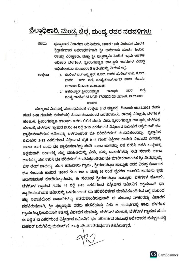 ಬೆಳಗೊಳ ಗ್ರಾಮದ ಸರ್ವೆ ನಂ 44 ರ 2.13 ಎಕರೆ ವಿಸ್ತೀರ್ಣದ ಪೈಕಿ 14 ಗುಂಟೆ ವಿಸ್ತೀರ್ಣ ಕಾವೇರಿ ನೀರಾವರಿ ನಿಗಮಕ್ಕೆ ಸೇರಿದ ಜಾಗ ಎಂದು ಭೂಸ್ವಾಧೀನವಾಗಿದೆ. ಈ ಜಾಗವನ್ನೂ ಸಹ ಸೇರಿಸಿ ವಸತಿ ಉದ್ದೇಶಕ್ಕಾಗಿ ಆಕ್ರಮವಾಗಿ ಸರ್ಕಾರಕ್ಕೆ ತಪ್ಪು ಮಾಹಿತಿ ಸುಳ್ಳು ದಾಖಲೆಗಳನ್ನು ನೀಡಿ ಶ್ರೀರಂಗಪಟ್ಟಣ ತಾಲೂಕಿನ ಹೊಸ ಆನಂದೂರು ಗ್ರಾಮದ ವೀರಭದ್ರಯ್ಯ ನವರಿಗೆ ಭೂ ಪರಿವರ್ತನೆ ಮಾಡಲಾಗಿದೆ. ಹೀಗಾಗಿ ಇವರ ವಿರುದ್ಧ ಭೂ ಕಂದಾಯ ಕಾಯಿದೆ 1964ರ ಕಲಂ 19: ಎ ಮತ್ತು 95ದಂತೆ ಪ್ರಕರಣ ದಾಖಲಿಸಿ ಕ್ರಮ ಜರುಗಿಸುವಂತೆ ಬೆಳಗೊಳ ರೆವೆನ್ಯೂ ಇನ್ಸ್ಪೆಕ್ಟರ್ ಸಿ.ಬಸವರಾಜು ಕೆ ಆರ್ ಸಾಗರ ಪೊಲೀಸರಿಗೆ ಈ ಸಂಬಂಧ ದೂರು ನೀಡಿದ್ದರು.ಈ ಸುದ್ದಿ ಕೆಲವು ದಿನಗಳ ಹಿಂದೆ Tv10 ಕನ್ನಡ ವಾಹಿನಿಯಲ್ಲಿ ವರದಿ ಮಾಡಲಾಗಿತ್ತು.