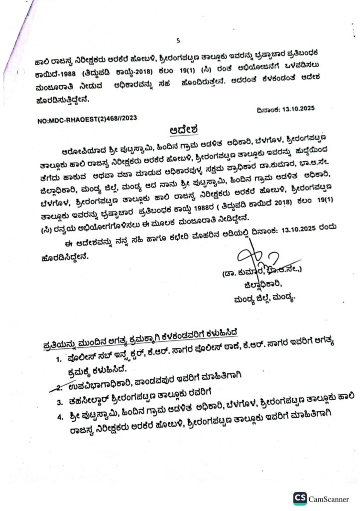 ಶ್ರೀರಂಗಪಟ್ಟಣ ತಾಲೂಕಿನ ಬೆಳಗೊಳ ಗ್ರಾಮದ ಸರ್ವೇ ನಂ. 44ರಲ್ಲಿ 2.13 ಎಕರೆ ವಿಸ್ತೀರ್ಣದ ಜಮೀನಿಗೆ ಸರ್ಕಾರಿ ನಾಲಾ ಜಾಗವನ್ನೂ ಸಹ ಸೇರಿಸಿ ವಸತಿ ಉದ್ದೇಶಕ್ಕೆ ಭೂ ಪರಿವರ್ತನೆ ಮಾಡಿದ್ದಾರೆನ್ನಲಾದ ಆರೋಪ ಮೇಲ್ನೋಟಕ್ಕೆ ಸಾಬೀತಾಗಿರುವ ಹಿನ್ನಲೆ ರಾಜಸ್ವ ನಿರೀಕ್ಷಕ ಹಾಗೂ ಗ್ರಾಮ ಆಡಳಿತಾಧಿಕಾರಿ ಅವರ ವಿರುದ್ಧ ಪ್ರಾಸಿಕ್ಯೂಷನ್ ಗೆ ಮಂಡ್ಯ ಜಿಲ್ಲಾಧಿಕಾರಿ ಡಾ. ಕುಮಾರ್ ಅನುಮತಿ ನೀಡಿದ್ದಾರೆ.