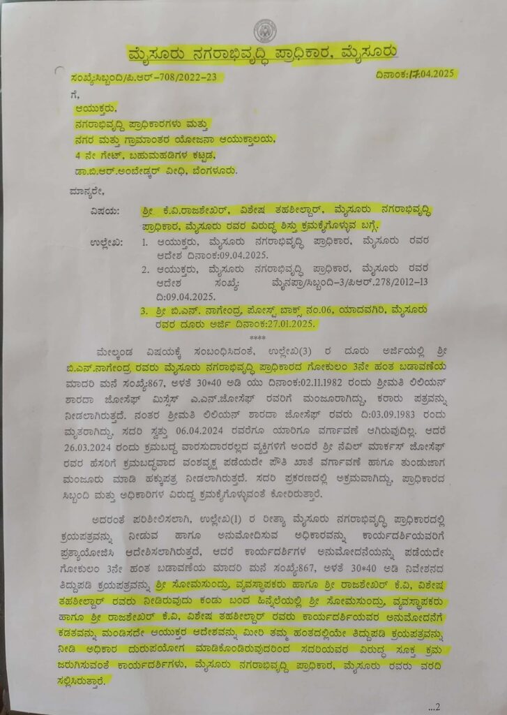 ಗೋಕುಲಂ 3 ನೇ ಹಂತ ನಿವೇಶನ ಸಂಖ್ಯೆ 867 ಲಿಲಿಯನ್ ಶಾರದಾ ಜೋಸೆಫ್ ಎಂಬುವರಿಗೆ ಮುಡಾದಿಂದ 2-1-1982 ರಲ್ಲಿ ಮಂಜೂರಾಗಿದೆ.3-12-1982 ರಲ್ಲಿ ಸ್ವಾಧೀನ ಪತ್ರ ನೀಡಲಾಗಿದೆ.3-09-1983 ರಲ್ಲಿ ಲಿಲಿಯನ್ ಶಾರದಾ ಜೋಸೆಫ್ ಮೃತಪಟ್ಟಿದ್ದಾರೆ.22-05-2008 ರಲ್ಲಿ ಪೌತಿದಾರರ ಕುಟುಂಬ ಜೀವಿತ ಪತ್ರದಂತೆ ಹಾಗೂ ನೊಂದಾಯಿತ ವಿಭಾಗ ಪತ್ರದಂತೆ ನವಿಲ್ ಮಾರ್ಕಸ್ ಜೋಸೆಫ್ ಎಂಬುವರಿಗೆ ಸೇರಿದೆ ಎಂದು ದಾಖಲೆಗಳನ್ನ ಸೃಷ್ಟಿಸಿ 06-04-2024 ರಂದು ವರ್ಗಾವಣೆ ಮಾಡಿ ಇದಕ್ಕೆ ಹೊಂದಿಕೊಂಡಂತಿರುವ ತುಂಡು ಜಾಗವನ್ನೂ ಸೇರಿ ಕ್ರಯಪತ್ರ ಮಾಡಿಕೊಡಲಾಗಿದೆ.ಸದರಿ ಕ್ರಯಪತ್ರ ನಿಯಮಬಾಹಿರವಾಗಿದೆ ಎಂದು ಆರೋಪಿಸಿ RTI ಕಾರ್ಯಕರ್ತ ಬಿ.ಎನ್.ನಾಗೇಂದ್ರ ರವರು ಸರ್ಕಾರಕ್ಕೆ ದೂರು ನೀಡಿದ್ದರು.ದೂರಿನ ಅನ್ವಯ ದಾಖಲೆಗಳನ್ನ ಪರಿಶೀಲಿಸಿದ ಅಧಿಕಾರಿಗಳು ಅಕ್ರಮ ಬೆಳಕಿಗೆ ಬಂದ ಹಿನ್ನಲೆ