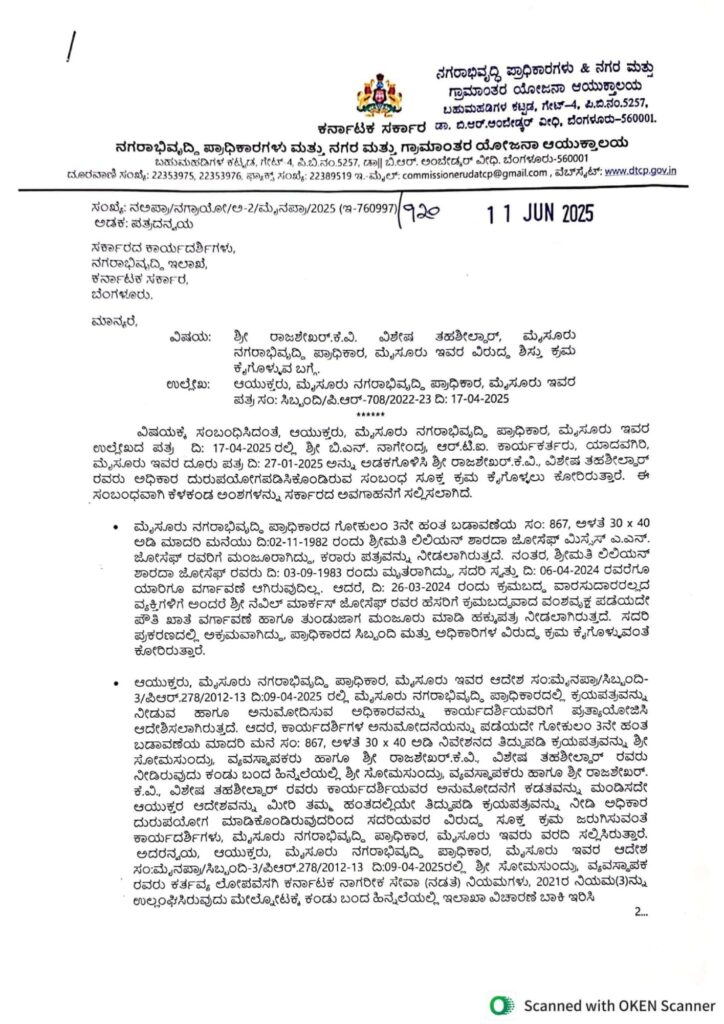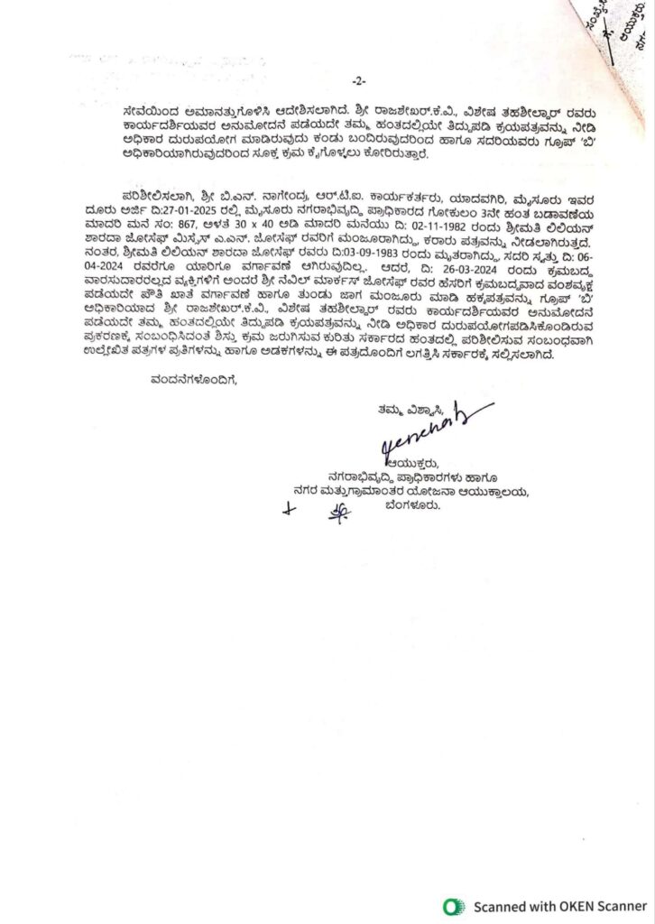 MDA ವಿಶೇಷ ತಹಸೀಲ್ದಾರ್ ರಾಜಶೇಖರ್ ಹಾಗೂ ವ್ಯವಸ್ಥಾಪಕ ಸೋಮುಸುಂದ್ರ ಇಬ್ಬರನ್ನ ಸಸ್ಪೆಂಡ್ ಮಾಡಿತ್ತು.ಅಮಾನತನ್ನ ಪ್ರಶ್ನಿಸಿ ಸದರಿಯವರು ತಡೆಯಾಜ್ಞೆ ತಂದಿದ್ದಾರೆ.ಆದರೆ ಇನ್ನೂ ಇಲಾಖಾ ತೆನಿಖೆ ನಡೆಯುತ್ತಿದೆ.ತೆನಿಖೆ ಪೂರ್ಣವಾಗುವವರೆಗೆ ಸದರಿ ಆಸ್ತಿಗೆ ಸಂಬಂಧಿಸಿದಂತೆ ಯಾವುದೇ ವಹಿವಾಟು ನಡೆಸಬಾರದೆಂದು ಮೈಸೂರು ಅಭಿವೃದ್ದಿ ಪ್ರಾಧಿಕಾರದ ಆಯುಕ್ತರಾದ ಕೆ.ಆರ್.ರಕ್ಷಿತ್ ರವರು ಮೈಸೂರು ಮಹಾನಗರ ಪಾಲಿಕೆ ವಲಯ ಕಚೇರಿ 4 ರ ಆಯುಕ್ತರಿಗೆ ಪತ್ರ ಬರೆದಿದ್ದಾರೆ.ಬಿ.ಎನ್.ನಾಗೇಂದ್ರ ರವರು ನೀಡಿದ ದೂರು ಗಂಭೀರ ಪರಿಣಾಮ ಬೀರಿದೆ…