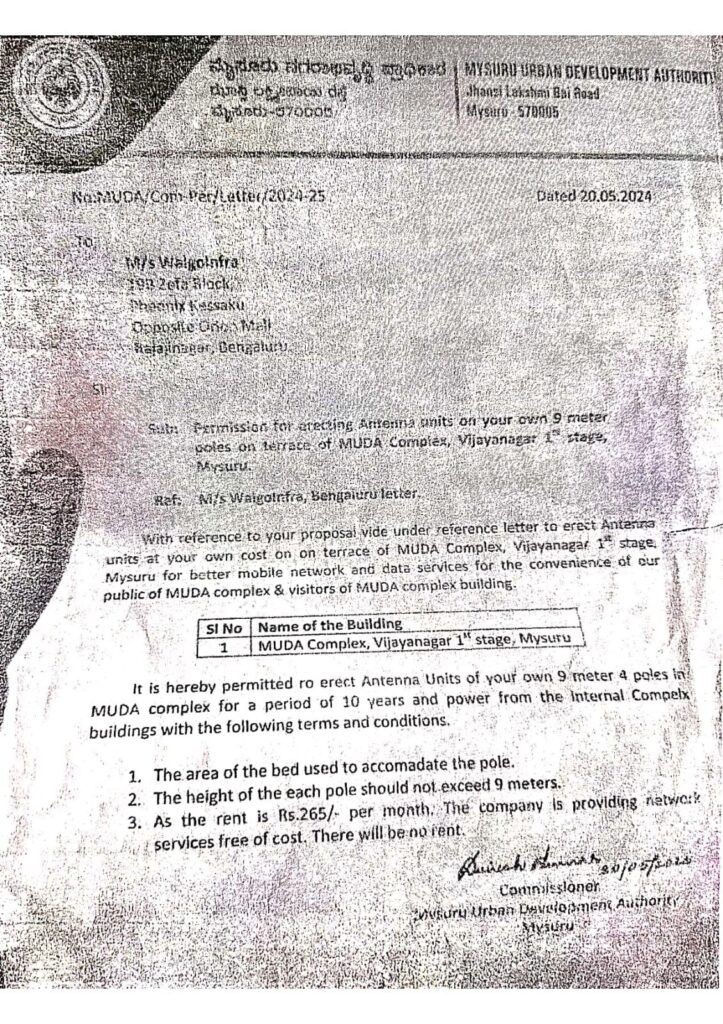 ಮುಡಾ(MDA)ಮತ್ತೊಂದು ಎಡವಟ್ಟು…ಮಾಸಿಕ 265/- ಕ್ಕೆ ಮೊಬೈಲ್ ಟವರ್ ಅಳವಡಿಕೆಗೆ ಅನುಮತಿ…ಮುಡಾ ಕಟ್ಟಡದ ಮೇಲೆ ಸ್ಥಾಪನೆ…ಬಾಡಿಗೆಯನ್ನೂ ವಸೂಲಿ ಮಾಡದ ಮುಡಾ…ಬೆಳಕಿಗೆ ಬಂದ ಭಾರಿ ಗೋಲ್ ಮಾಲ್…