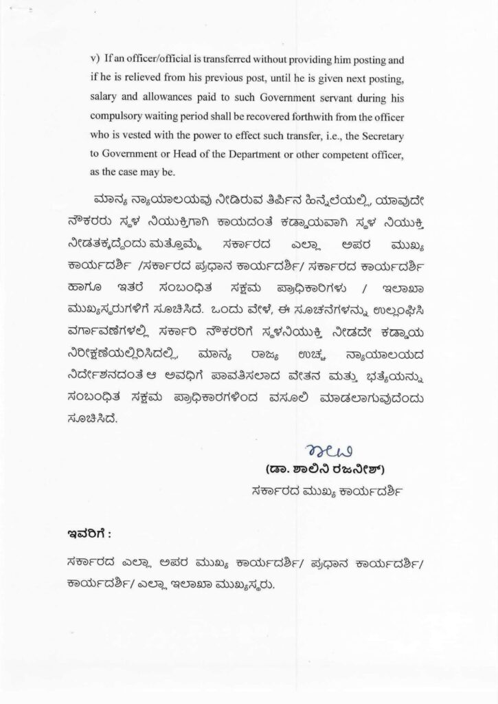 ಸ್ಥಳ ನಿಯುಕ್ತಿಗೊಳಿಸದೆ ಸರ್ಕಾರಿ ನೌಕರರನ್ನ ವರ್ಗಾವಣೆ ಮಾಡಿದ್ರೆ ಜೋಕೆ…ಅಧಿಕಾರಿಗಳಿಗೆ ರಾಜ್ಯ ಸರ್ಕಾರದ ಮುಖ್ಯ ಕಾರ್ಯದರ್ಶಿ ಶಾಲಿನಿ ರಜನೀಶ್ ಖಡಕ್ ವಾರ್ನಿಂಗ್…