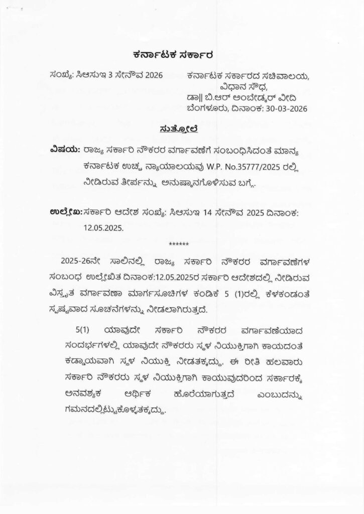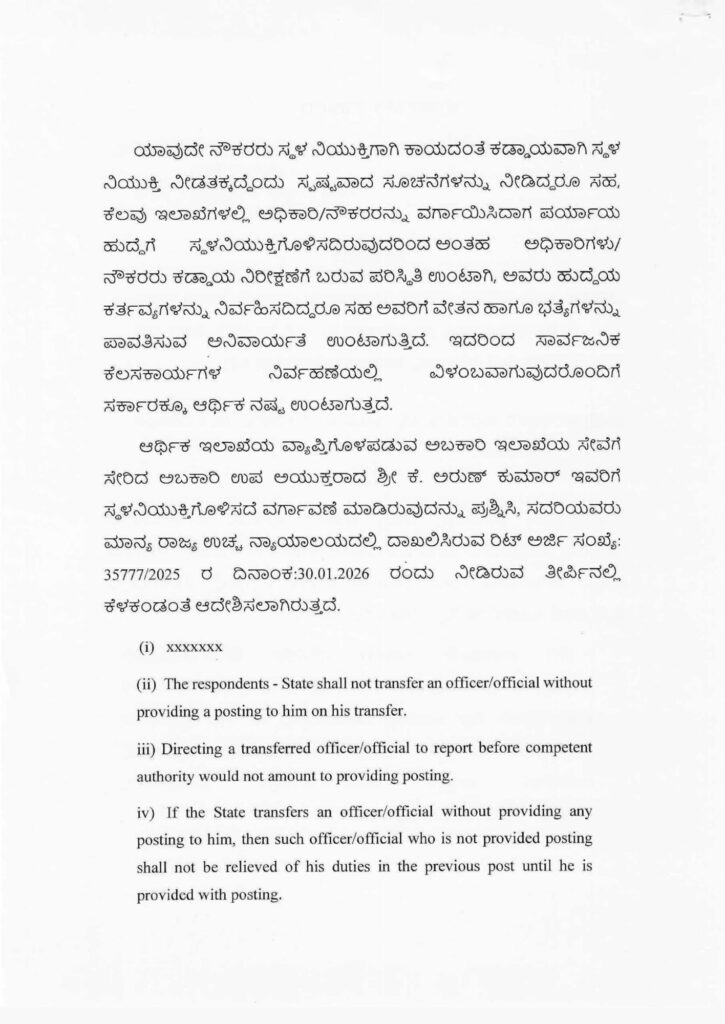 ಸ್ಥಳ ನಿಯುಕ್ತಿಗೊಳಿಸದೆ ಸರ್ಕಾರಿ ನೌಕರರನ್ನ ವರ್ಗಾವಣೆ ಮಾಡುವ ವಿಚಾರದಲ್ಲಿ ಸರ್ಕಾರದ ಮುಖ್ಯ ಕಾರ್ಯದರ್ಶಿ ಶಾಲಿನ ರಜನೀಶ್ ಅಧಿಕಾರಿಗಳಿಗೆ ಖಡಕ್ ವಾರ್ನಿಂಗ್ ನೀಡಿದ್ದಾರೆ.12/5/25 ರ ರಾಜ್ಯ ಸರ್ಕಾರಿ ನೌಕರರ ವರ್ಗಾವಣೆ ಮಾರ್ಗಸೂಚಿ ಪಾಲಿಸುವಂತೆ ಸೂಚನೆ ನೀಡಿದ್ದಾರೆ.ಮಾರ್ಗಸೂಚಿ ಅನ್ವಯ ಯಾವುದೇ ನೌಕರ/ಅಧಿಕಾರಿ ಯನ್ನು ಸ್ಥಳನಿಯುಕ್ತಿ ಮಾಡದೆ ವರ್ಗಾವಣೆ ಮಾಡುವಂತಿಲ್ಲ ಎಂಬ ಆದೇಶವನ್ನು ವನ್ನು ಗಣನೆಗೆ ತೆಗೆದುಕೊಳ್ಳದೇ ಅದೇ ಚಾಳಿ ಮುಂದುವರೆದಿರುವು ದನ್ನು ಕಂಡ ಕರ್ನಾಟಕ ರಾಜ್ಯ ಸರ್ಕಾರದ ಮುಖ್ಯ ಕಾರ್ಯದರ್ಶಿಗಳಾದ ಶಾಲಿನಿ ರಜನೀಶ್ ಮತ್ತೊಮ್ಮೆ ಘನ ಉಚ್ಚ ನ್ಯಾಯಾಲಯದ ರಿಟ್ ಅರ್ಜಿ ಸಂಖ್ಯೆ. 35777/2025 ದಿ.30/01/2026 ರ ಆದೇಶವನ್ನು ಉಲ್ಲೇಖಿಸಿ ರಾಜ್ಯ ಸರ್ಕಾರದ ಯಾವುದೇ ನೌಕರ/ಅಧಿಕಾರಿಯನ್ನು ಸ್ಥಳನಿಯುಕ್ತಿ ಗಳಿಸದೇ ವರ್ಗಾವಣೆ ಮಾಡಿಬಾರದೆಂದು ಎಚ್ಚರಿಸಿದ್ದಾರೆ. ಕೆಲಸ ಪಡೆಯದೇ ಸುಮ್ಮನೆ ಸಂಬಳ ಕೊಡುವುದು ಆರ್ಥಿಕ ನಷ್ಟವಾಗುತ್ತದೆ. ಹೀಗಾಗಿ ರಾಜ್ಯ ಸರ್ಕಾರದ ಯಾವುದೇ ನೌಕರ/ಅಧಿಕಾರಿ ಯನ್ನು ಸ್ಥಳನಿಯುಕ್ತಿ ಗಳಿಸದೇ ವರ್ಗಾವಣೆ ಮಾಡುವಂತಿಲ್ಲ. ಮಾಡಿದ್ದಲ್ಲಿ ಆ ರೀತಿ ಆದೇಶಿಸಿದ ಸಕ್ಷಮ ಪ್ರಾಧಿಕಾರದಿಂದ ಆ ನೌಕರ/ಅಧಿಕಾರಿಯಿಂದ ಸ್ಥಳ ನಿರೀಕ್ಷಣೆ ಅವಧಿಯ ಸಂಬಳ ವಸೂಲಿ ಮಾಡಲಾಗುವುದು ಎಂದು ಎಚ್ಚರಿಕೆ ನೀಡಿದ್ದಾರೆ…