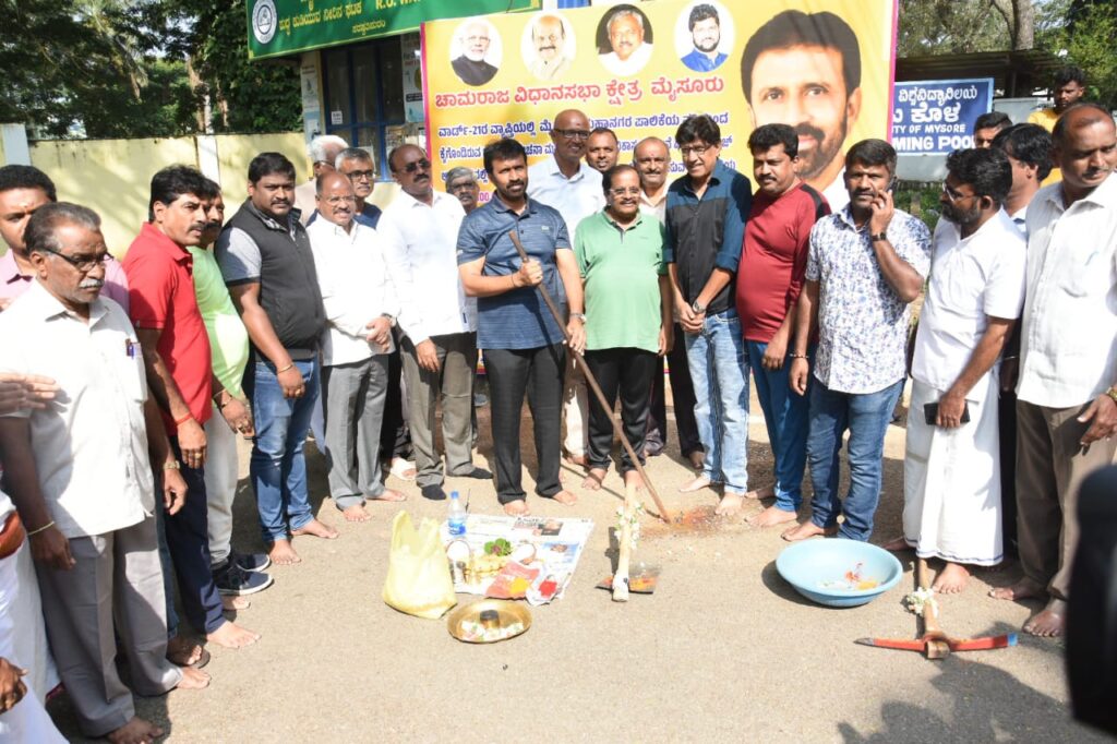 ಮೈಸೂರು: 08-11-2022 ರ ಮಾನ್ಯ ಚಾಮರಾಜ ವಿಧಾನಸಭಾ ಕ್ಷೇತ್ರದ ಶಾಸಕರಾದ ಶ್ರೀ ಎಲ್.ನಾಗೇಂದ್ರ ರವರು ಮಹಾನಗರ ಪಾಲಿಕೆ ಉಪಾಯುಕ್ತರು (ಅಭಿವೃದ್ದಿ) ರವರೊಂದಿಗೆ ಮೈಸೂರು ಮಹಾನಗರ ಪಾಲಿಕೆಯ ವತಿಯಿಂದ ಕೈಗೊಂಡಿರುವ ಶಾಸಕರ ವಿವೇಚನಾ *ಮಹಾತ್ಮ ಗಾಂಧಿ ನಗರ ವಿಕಾಸ ಯೋಜನೆ ವಿಶೇಷ ಪ್ಯಾಕೇಜ್ ಅನುದಾನದಲ್ಲಿ *ವಾರ್ಡ್-21 ಕ್ಕೆ ಸೇರಿದ ಪಾರ್ಕ್ ಅಭಿವೃದ್ದಿ ಹಾಗೂ ಸ್ವಿಮ್ಮಿಂಗ್ ಫೂಲ್ ರಸ್ತೆಯ ಅಭಿವೃದ್ದಿ ಕಾಮಗಾರಿಯ ಮೊತ್ತ ರೂ.100.00 ಲಕ್ಷದ ಕಾಮಗಾರಿಗೆ ಭೂಮಿ ಪೂಜೆಯನ್ನು ನೆರವೇರಿಸಿದರು* ಭೂಮಿ ಪೂಜೆ ನೆರವೇರಿಸಿದ ನಂತರ ಪಕ್ಕದಲ್ಲಿರುವ ಈಜು ಕೊಳದ ಮುಂಬಾಗದ ವಿಶಾಲವಾದ ಜಾಗವು, ಅಶುಚಿತ್ವದಿಂದ ಕೂಡಿದ್ದು ಈ ರಸ್ತೆ, ಫುಟ್ ಪಾತ್, ಗಳನ್ನು ಸಮಗ್ರವಾಗಿ ಅಭಿವೃದ್ದಿಗೊಳಿಸಲು ಸ್ಥಳ ಪರಿಶೀಲನೆ ನಡೆಸಿ ಈ ಜಾಗದಲ್ಲಿ ತಿರುಗಾಡಲು ಉತ್ತಮ ರಸ್ತೆ, ಬೋಗಾದಿ ರಸ್ತೆಗೆ ಸೇರುವ ರಸ್ತೆ ಕಾಂಕ್ರೀಟ್ ರಸ್ತೆ ನಿರ್ಮಾಣ, ಇಂಟರ್ ಲಾಕಿಂಗ್, ಕುಳಿತುಕೊಳ್ಳಲು ಉತ್ತಮ ಕಾಂಕ್ರೀಟ್ ಆಸನ ಮೇಲ್ಚಾವಣಿ ಮುಂತಾದ ನವೀನ ಮಾದರಿಯಲ್ಲಿ ಅಭಿವೃದ್ದಿಗೊಳಿಸಲು ಅಂದಾಜು ಪಟ್ಟಿ ತಯಾರಿಸಿ ಅಗತ್ಯ ಅನುದಾನ ನೀಡಿ ಕಾಮಗಾರಿ ಪ್ರಾರಂಬಿಸಲು ಉಪ ಆಯುಕ್ತರು (ಅಭಿವೃದ್ದಿ) ಮೈಸೂರು ಮಹಾನಗರಪಾಲಿಕೆ ರವರಿಗೆ ಸೂಚನೆ ನೀಡಿದರು,